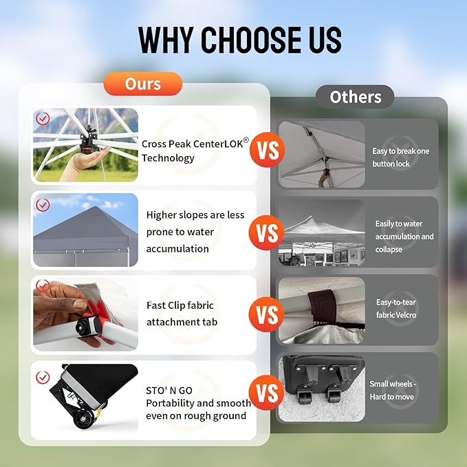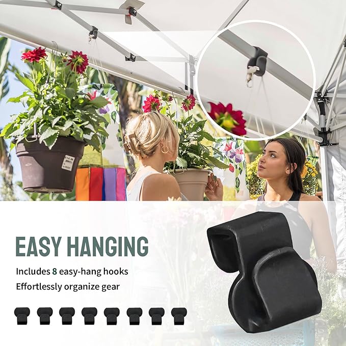 • CONVENIENT TRANSPORT & STORAGE: With a weight of just 48.5 lbs and the Sto'N Go bag featuring 4” enlarged wheels, this canopy is easy to transport and maneuver. Comprehensive accessories included for a complete setup experience.