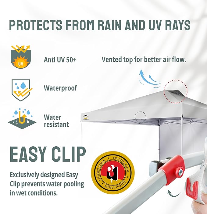 • FAST CLIP CANOPY FABRIC - The newly designed clip system makes it easy to attach the canopy fabric to the frame. The silver-coated interior provides exceptional UPF 50+ UV protection, ensuring cooler, safer shade. Made from rugged 150D fabric, the canopy is water-resistant and CPAI-84-rated for flame resistance. The canopy features integrated air vents, and the fast clip system prevents wind lift and rain pooling, reducing fabric tearing risks. Ideal for outdoor events, weddings, and gatherings.
