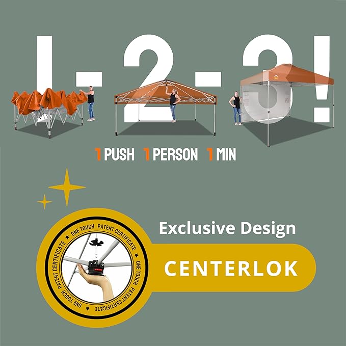 • ONE BUTTON EASY SET UP - Our 10x10 pop up canopy tent features patented one push center lock tech. With just a single push, the central hub locks the poles in place. Designed for the next generation, this outdoor canopy for patio can be set up by two people in seconds without any tools. Three adjustable height settings with soft, pinch-free buttons ensure convenience and safety, making it perfect for camping, beach outings, craft fairs, tailgating, farmer markets, outdoor BBQs, and more