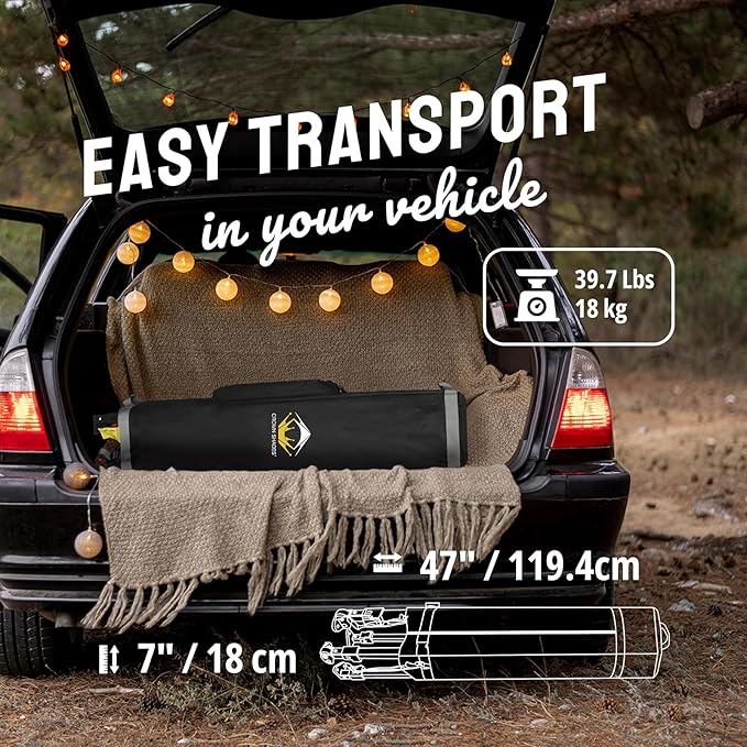 • SPACIOUS AND COMPACT - With a 10' x 10' canopy footprint, this tent provides 100 square feet of shade, accommodating up to 10 people comfortably. The interior height exceeds 9 feet, and the maximum clearance under the valance is over 6 feet. When packed, the dimensions are 45” x 8.5” x 8.5”, fitting perfectly in your vehicle’s trunk. The headroom is enhanced by the absence of overhead crossbars, offering more spaciousness compared to traditional designs, making it great for parties and events