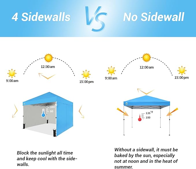 • [LARGE SPACE]: The canopy has a 10' x 10' footprint and provides 100 square feet of shade. It has an interior height of over 9'5'' and a clearance of over 6' under the valance, providing plenty of standing room. The cool shade comfortably accommodates up to 10 seated people.