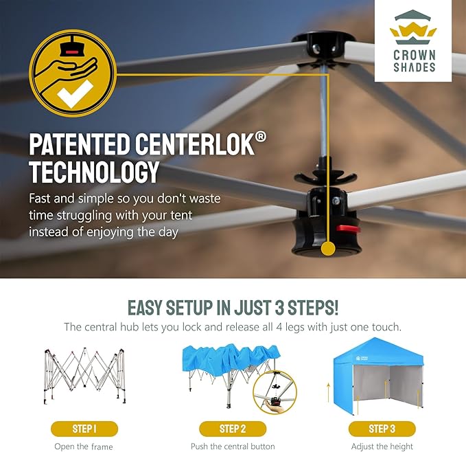 • [EASIEST SET UP]: The patented central lock technology allows you to lock all four legs with a single push at the center hub. The leg height can then be adjusted using soft, pinch-free buttons. The next-generation canopy has been designed for ease of use, allowing two people to set it up in a matter of seconds without the need for any tools.