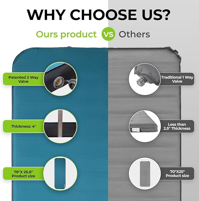 • All-Season, All-Terrain Comfort: From summer nights under the stars to chilly autumn getaways, this self-inflating pad is built for all seasons and terrains. Waterproof, thick, and durable enough to withstand uneven or rocky ground, it ensures warmth, dryness, and comfort no matter the conditions. Ideal for tents, car camping, hiking, home guests, or even emergency use - this pad is your reliable companion, wherever you rest.
