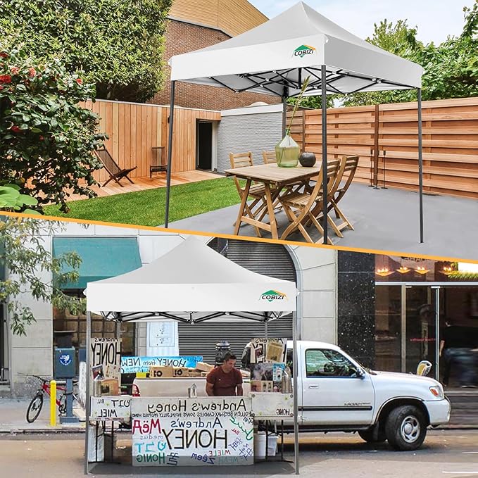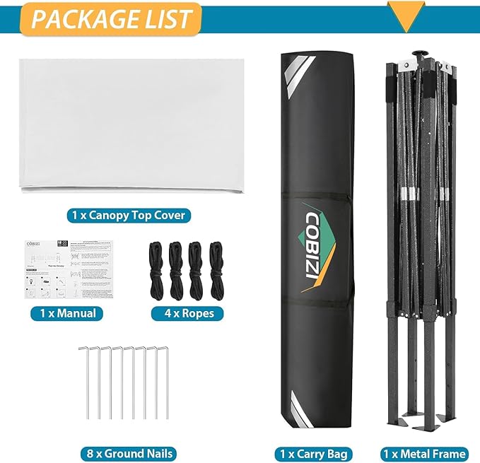 • 【43 SQ Feet Shade Area】COBIZI 6.6x6.6 pop up tent provides 43 SQFT spacious covered space, it can easily accommodate 3-5 people, meet your different needs for holding small gatherings. Perfect for wedding, birthday party, market event and other small events. When in use, always secure the 6.6x6.6 pop up tent with the included stakes and ropes to avoid damage. One year after-sale protection for canopy frame; Six months after-sale protection for fabrics and accessories.
