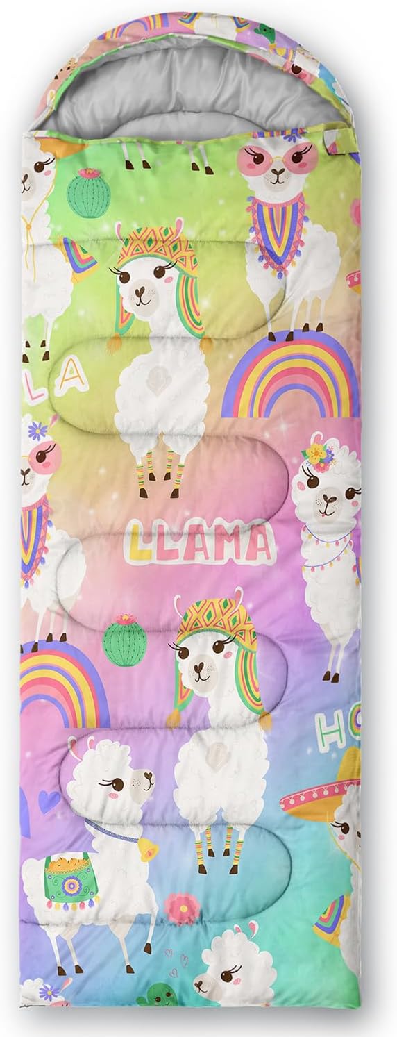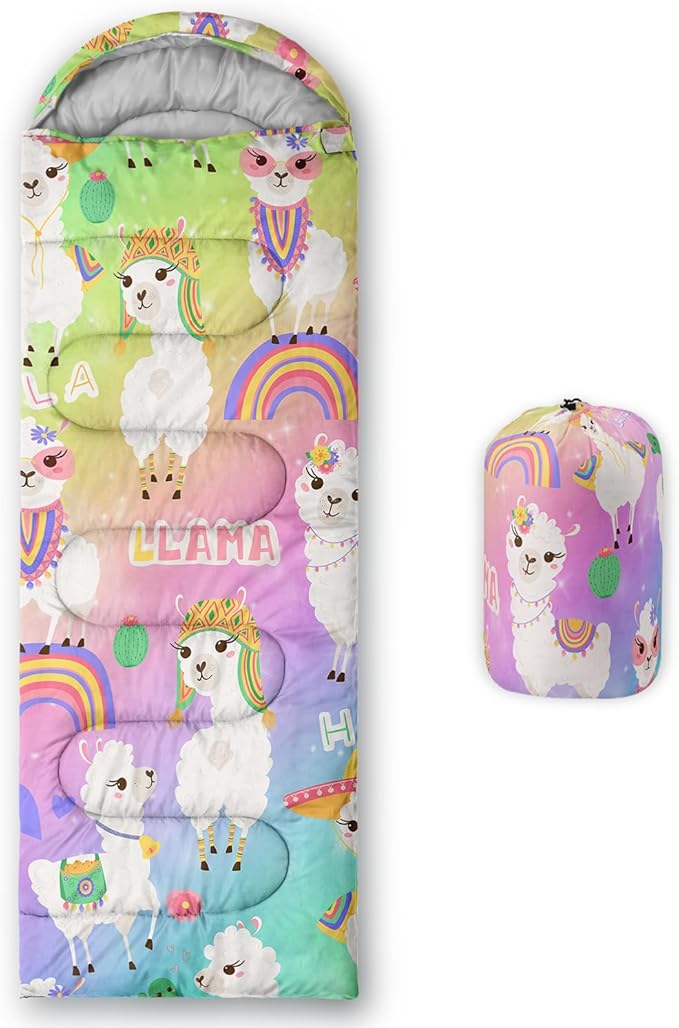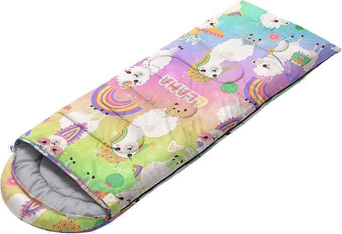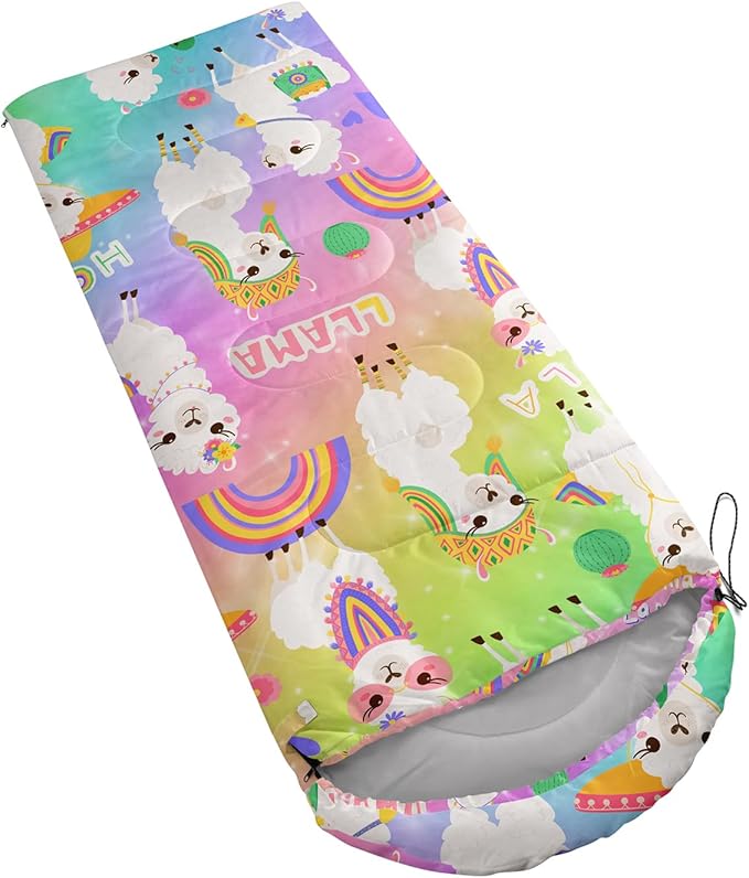 • Cartoon Rainbow Alpaca sleeping bags For All Seasons- Our camping sleeping bags are designed to give you a good night's sleep. Ideal for spring,summer,fall,and winter,rated from 32°F to 77°F (optimal comfort temperature is 50°F to 65°F). Stay comfortable and warm in any condition at normal altitude. Can be used for any outdoor adventure,class camping,summer camps,couch surfing,indoor blanket,and as an emergency blanket for vehicles.