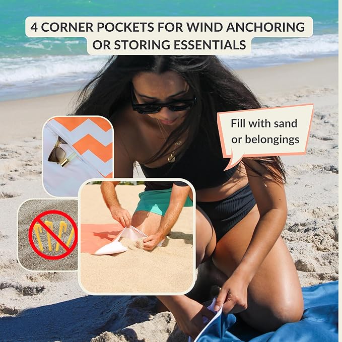 • WON'T FLAP IN THE WIND — Hidden corner pockets that can be used to weigh down blanket on windy days or simply hide or store personal belongings. Don't let the wind ruin your beach day, picnic, camping fun again.
