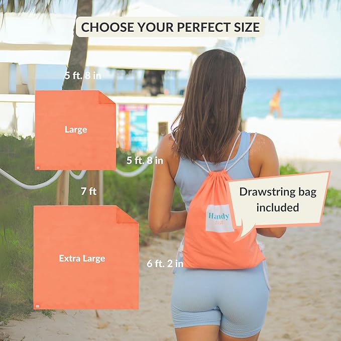 • SPACIOUS EASY PACK BAG — No more struggles with folding and squeezing your beach mat back into its bag. The Handy Beach Mat comes with it's own stylish and spacious drawstring bag so its easy to carry and put away when your done using it.