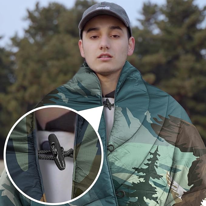 • Multipurpose Puffer Blanket and Poncho: This is a multi-purpose puffy blanket ultralight. In addition to being used as a warm camping blanket for sleeping for cold weather, the buttons on both sides combine to be used as a poncho, which is very convenient and can free your hands
