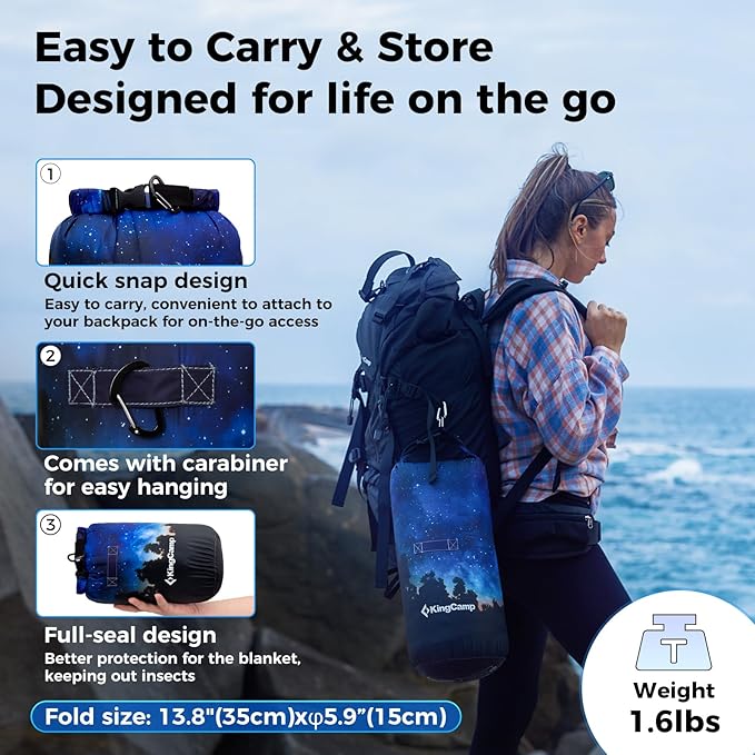 • LIGHTWEIGHT & PORTABLE - WARMTH ON THE GO: This camping blanket unfolds to a spacious 79"L × 57"W and weighs only 1.63 lbs-lighter than a bottle of water. It offers full coverage without the bulk. It compresses down to 13.8" × 6.7" × 6.7" in the included double-drawstring stuff sack, making it the ideal packable blanket for travel, backpacking, hiking, or road trips. Stay warm anywhere, anytime.