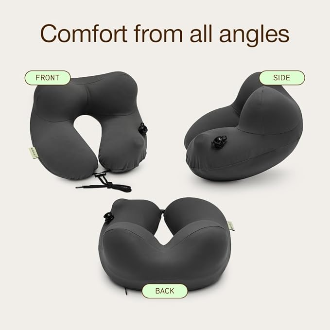 • Compact & Cozy Neck Pillow for Traveling: Unlike traditional travel pillows for airplanes, the AirJustable Travel Neck Pillow provides effortless comfort on any journey. Inflate to your preferred support level and use the clasp to adjust the cord for a secure, personalized fit. Deflate your airplane pillow in seconds, fold it, and store it in its convenient compact travel bag or attach it to your carry-on. Say goodbye to head bobbing and shoulder strain, and wake up refreshed, ready for your next adventure.