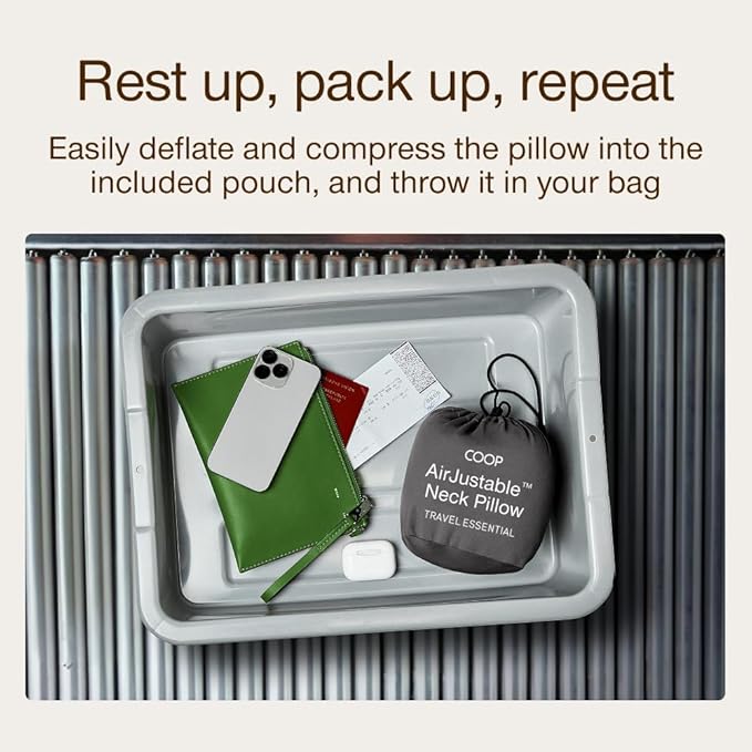• The Ultimate Customizable Travel Essential: Bring Coop’s signature adjustable comfort anywhere with the AirJustable Travel Neck Pillow. This airplane pillow features a unique inflatable design, offering personalized head, neck, and chin support that adapts to your sleep style. Featuring Coop’s memory foam Oomph fill and an adjustable cord, this travel pillow provides unmatched comfort in any position. Say goodbye to neck strain and restless naps, and enjoy deep, restful sleep on your travels!