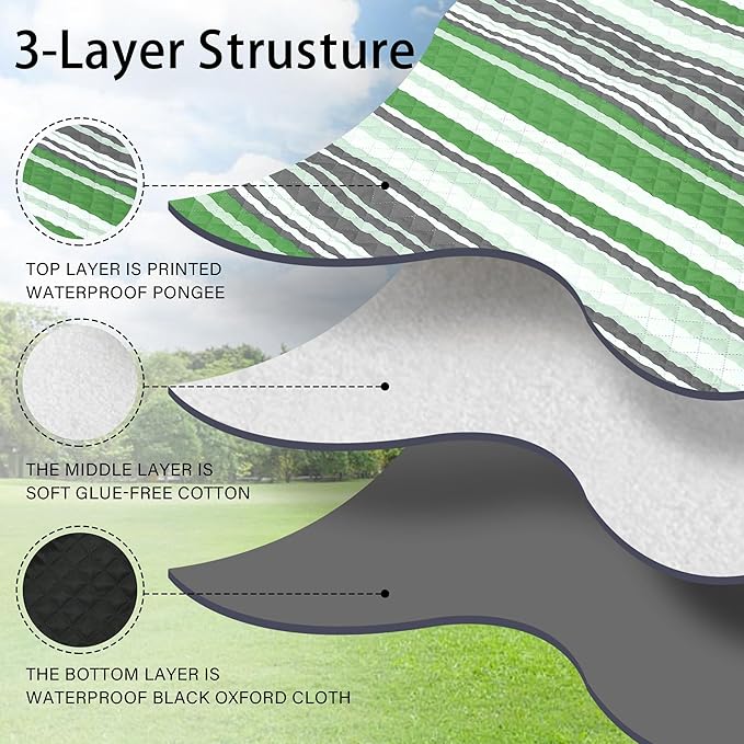 • 【Soft and Durable with 3-Layers】The picnic blanket top layer is printed waterproof pongee, the middle layer is soft glue-free cotton, and the bottom layer is waterproof black Oxford cloth. Perfectly suitable for siting or lying on grass, beach, floor or any kindly of surface, giving you soft and comfortable feelings.