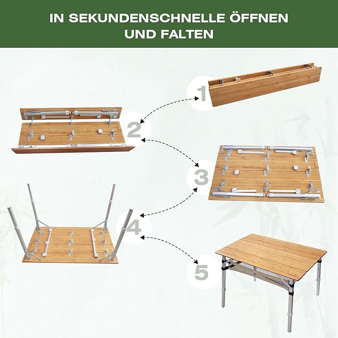 • Camping Table Bamboo: The adjustable aluminum alloy legs(18.11"/21.26"/25.2") provide lightweight stability, good rust resistance, and can support up to 132 lbs, ensuring a reliable outdoor dining experience.