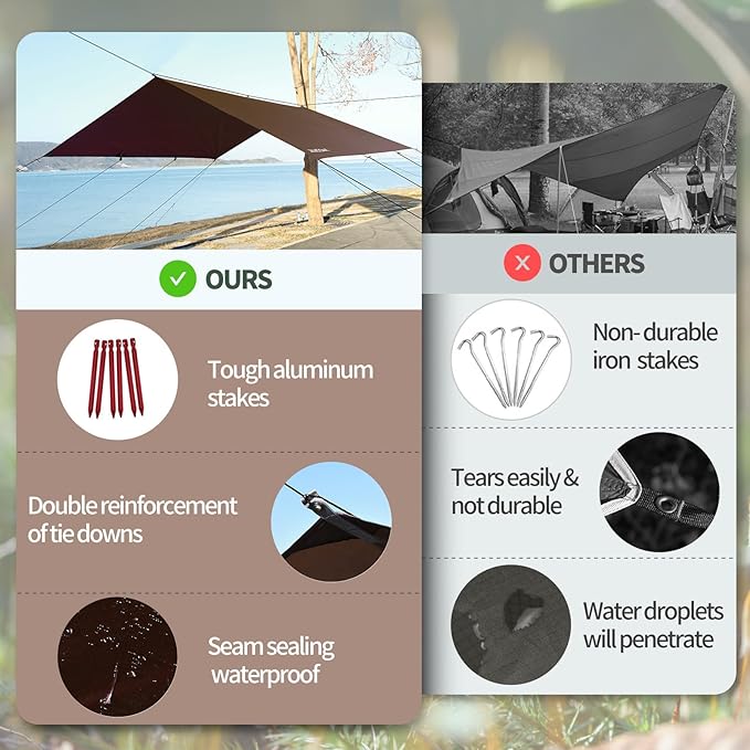 • High-quality complete set of accessories: One set can fulfill your camping needs without having to buy any other items. Package includes 1 tent tarp with 19 webbing straps, 6 rust-proof aluminum ground pegs, 8 adjustable nylon ropes, 1 ultralight carry bag for all your belongings, plus a super handy extra carry bag for accessories