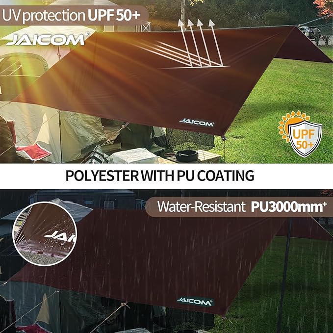 • Best protection: The JAICOM Camping Tarp is made from 210T tear-resistant polyester fabric that is highly abrasion resistant. The seams are all press-glued and the fabric has a waterproof coating, making our tarp highly waterproof. It gives you strong protection no matter how extreme the weather is