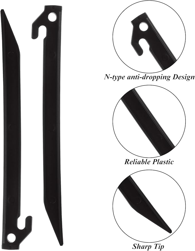 • Premium Materials: These tent stakes are made of high-quality PP plastic, these stakes are built to last, with a sturdy structure that resists breaking and fading. Unlike metal, this plastic tent stake won't rust or deteriorate, ensuring reliable performance throughout your outdoor adventures