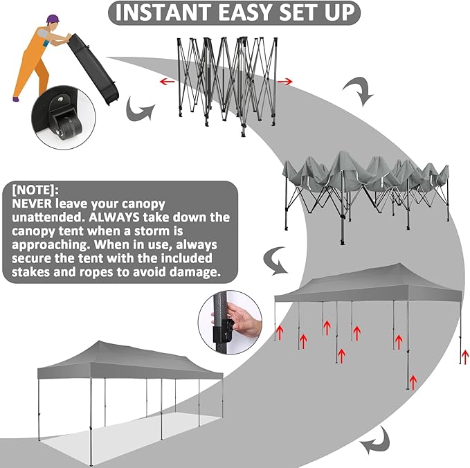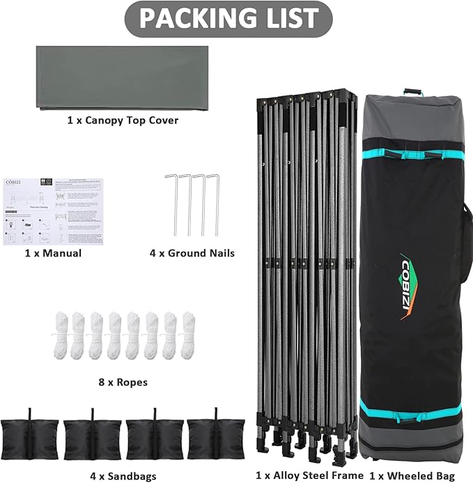 • 【300 SQ Feet Shade Area】COBIZI 10x30 pop up tent provides 300 SQFT spacious covered space, it can easily accommodate 15-20 people, meet your different needs for holding large gatherings. Perfect for wedding, birthday party, market event and other larger events. When in use, always secure the 10x30 pop up tent with the included stakes and ropes to avoid damage. One year after-sale protection for canopy frame; Six months after-sale protection for fabrics and accessories.