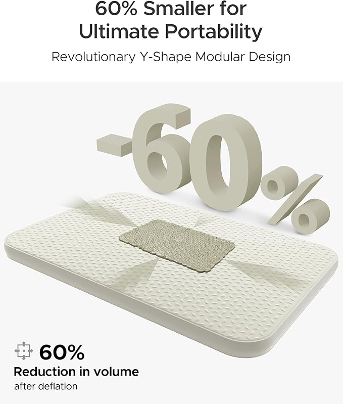 • ๐—œ๐—ป๐—ป๐—ผ๐˜ƒ๐—ฎ๐˜๐—ถ๐˜ƒ๐—ฒ ๐—จ๐—น๐˜๐—ฟ๐—ฎ-๐—ฝ๐—ผ๐—ฟ๐˜๐—ฎ๐—ฏ๐—น๐—ฒ ๐——๐—ฒ๐˜€๐—ถ๐—ด๐—ป: Our camping mattress features a Y-shaped foam telescopic structure that reduces its volume by 60% after deflation. As it deflates, it naturally forms a crease in the middle, facilitating easier rolling up. These designs ensure it's lighter and more compact than traditional foam air mattresses