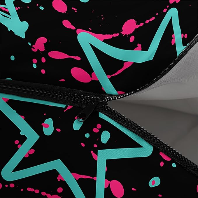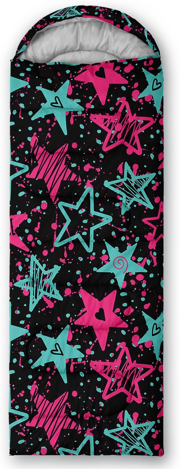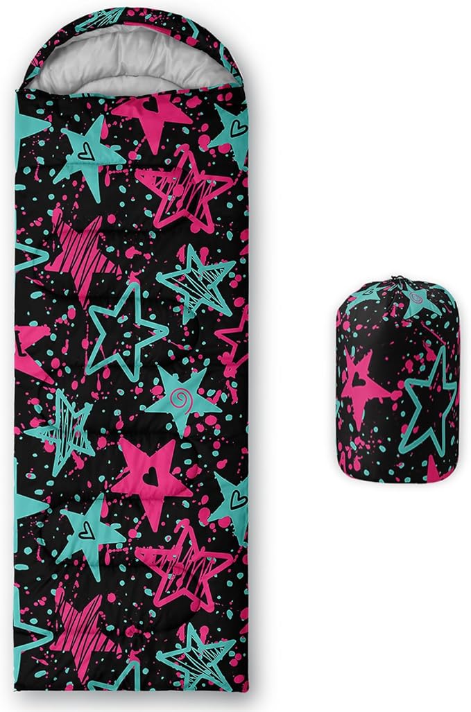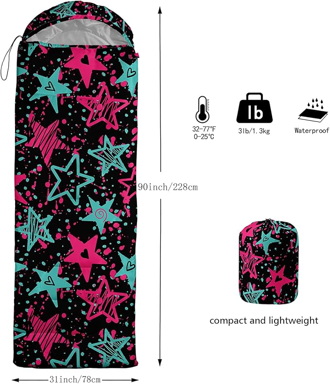 • 【Fits For 3 Seasons】: Size - 31 by 90 inches (W x D). Our Graffiti Style Stars sleeping bag can be used in 3 seasons with a design temperature of 32℉-77℉(0℃-25℃). These Cartoon Stars bags also have a weather resistant waterproof design to keep you warm and prevent you from any dampness.