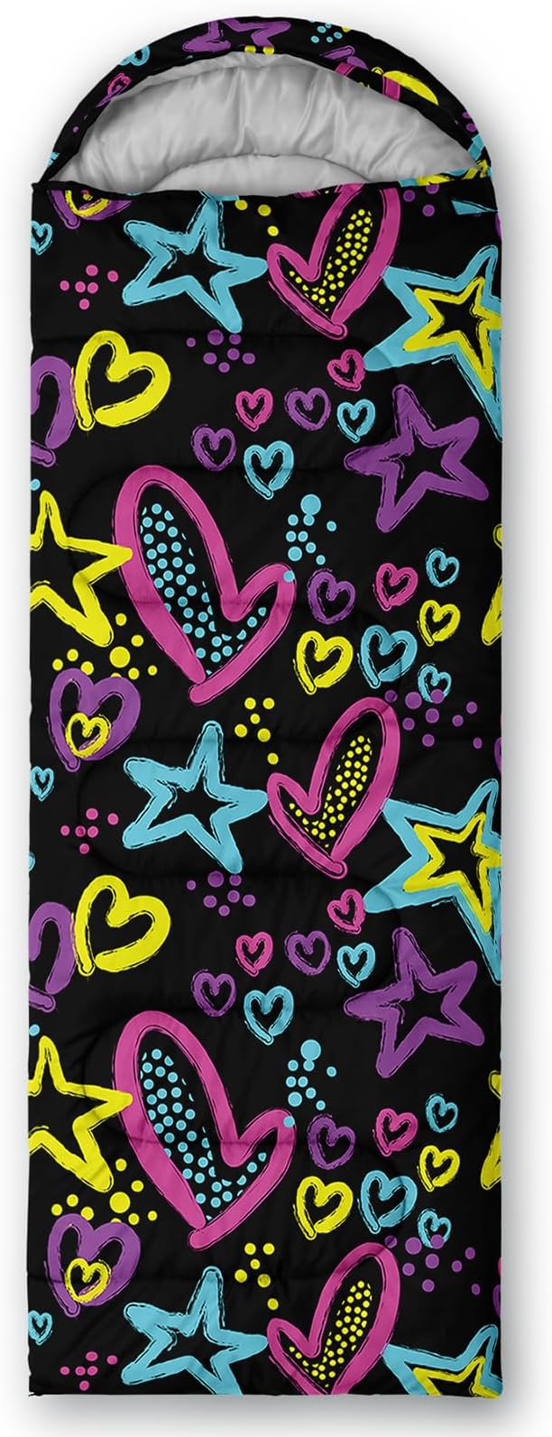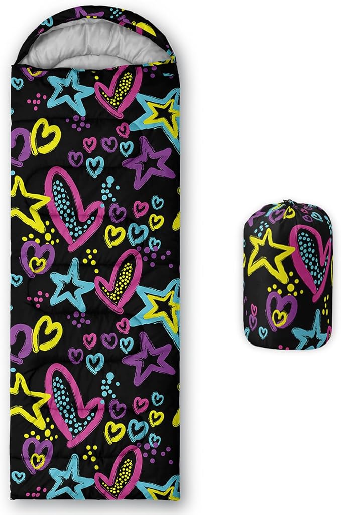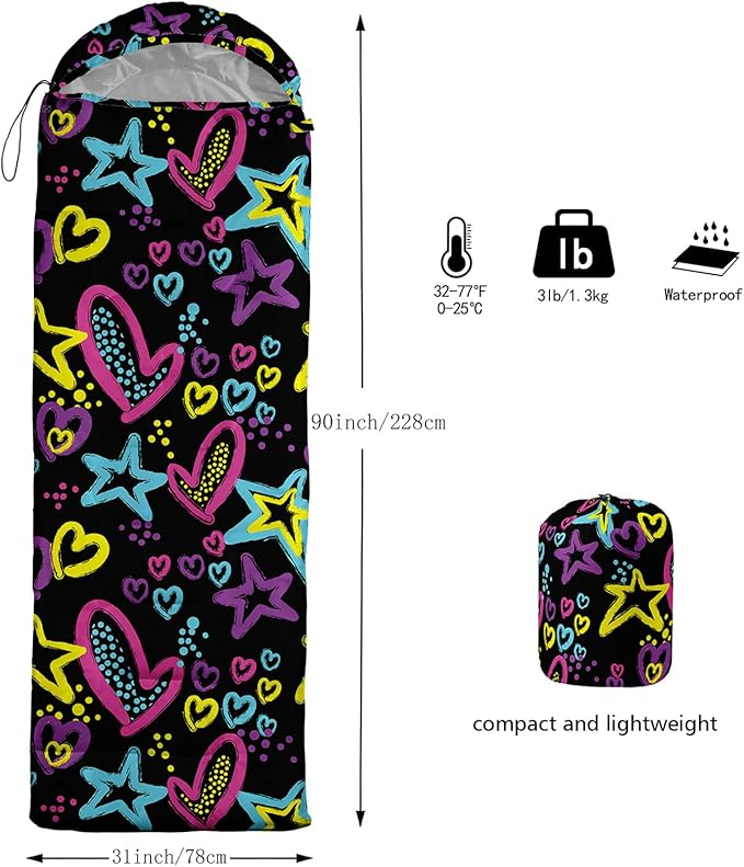 • 【Fits For 3 Seasons】: Size - 31 by 90 inches (W x D). Our Colorful Love sleeping bag can be used in 3 seasons with a design temperature of 32℉-77℉(0℃-25℃). These Cartoon bags also have a weather resistant waterproof design to keep you warm and prevent you from any dampness.