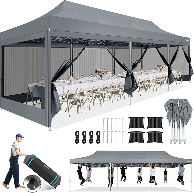 • Easy to Assemble & Portable: COBIZI 10x30 pop up tent is quick and easy to set up. It takes just a minute for 3-4 people to assemble or disassemble this pop up screen tent. The 10x30 commercial canopy tent includes a 600D Oxford cloth carry bag for easy transportation, making it ideal for parties, camping, beaches, craft shows, and farms. When not in use, simply fold the frame, sidewalls, and top neatly, and store everything in the carry bag for easy storage.