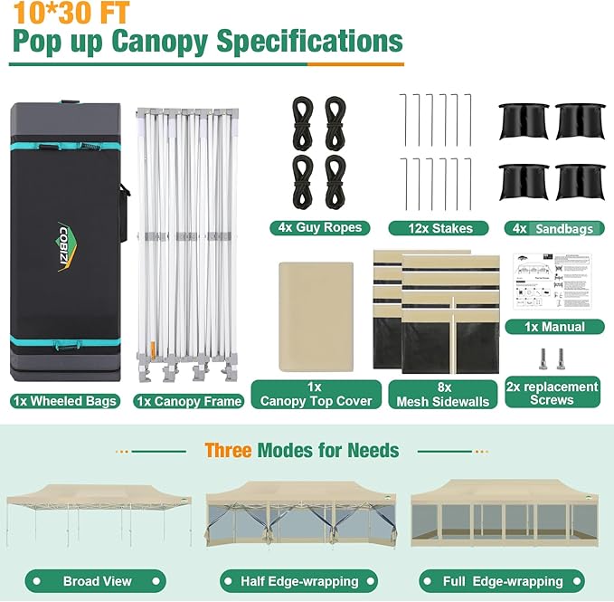 • Easy to Assemble & Portable: COBIZI 10x30 pop up tent is quick and easy to set up. It takes just a minute for 3-4 people to assemble or disassemble this pop up screen tent. The 10x30 commercial canopy tent includes a 600D Oxford cloth carry bag for easy transportation, making it ideal for parties, camping, beaches, craft shows, and farms. When not in use, simply fold the frame, sidewalls, and top neatly, and store everything in the carry bag for easy storage.
