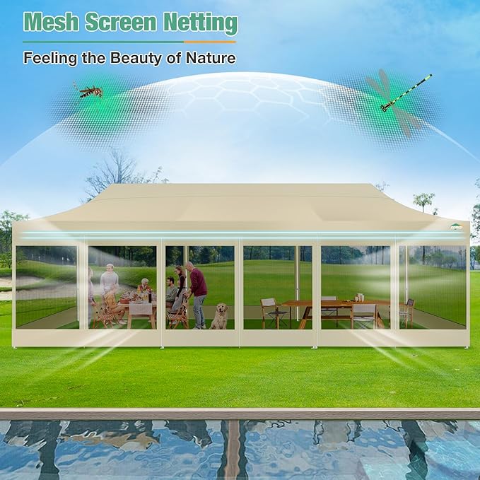 • Heavy Duty and Durable: 10x30 heavy duty pop up canopy with sidewalls comes with a heavy duty frame with a full truss structure and a 32mm tube diameter The frame is powder-coated for rust-proofing, making it durable. The 10x30 screen tents middle support pole can bear up to 1100 pounds.(NOTE: take it down when there is strong wind or heavy rain)