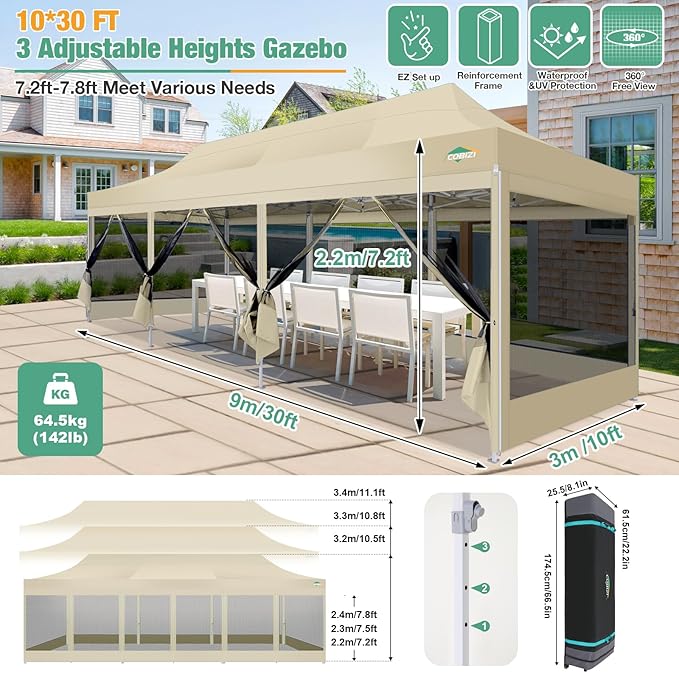 COBIZI 10x30 Canopy Tent, Heavy Duty Pop up Canopy with Sidewalls, Waterproof Easy Setup Canopy with Mosquito Netting, Outdoor Instant Screen Tents for Parties, Wedding with Roller Bag, Khaki