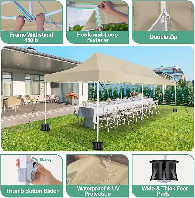 • Adjustable Height and Spacious Canopy: The 10x30 pop up gazebo easily adjusts to heights of 88, 92, or 96 inches with an upgraded thumb latch system. This event tent features an audible click to confirm secure setup. Covering 300 square feet, the party tent 10x30 can accommodate 15-30 people, perfect for large events like weddings, birthday parties, and backyard gatherings. Versatile for use on surfaces like grass, concrete, and sand. (Note: Some surfaces may limit the use of stakes and ropes).