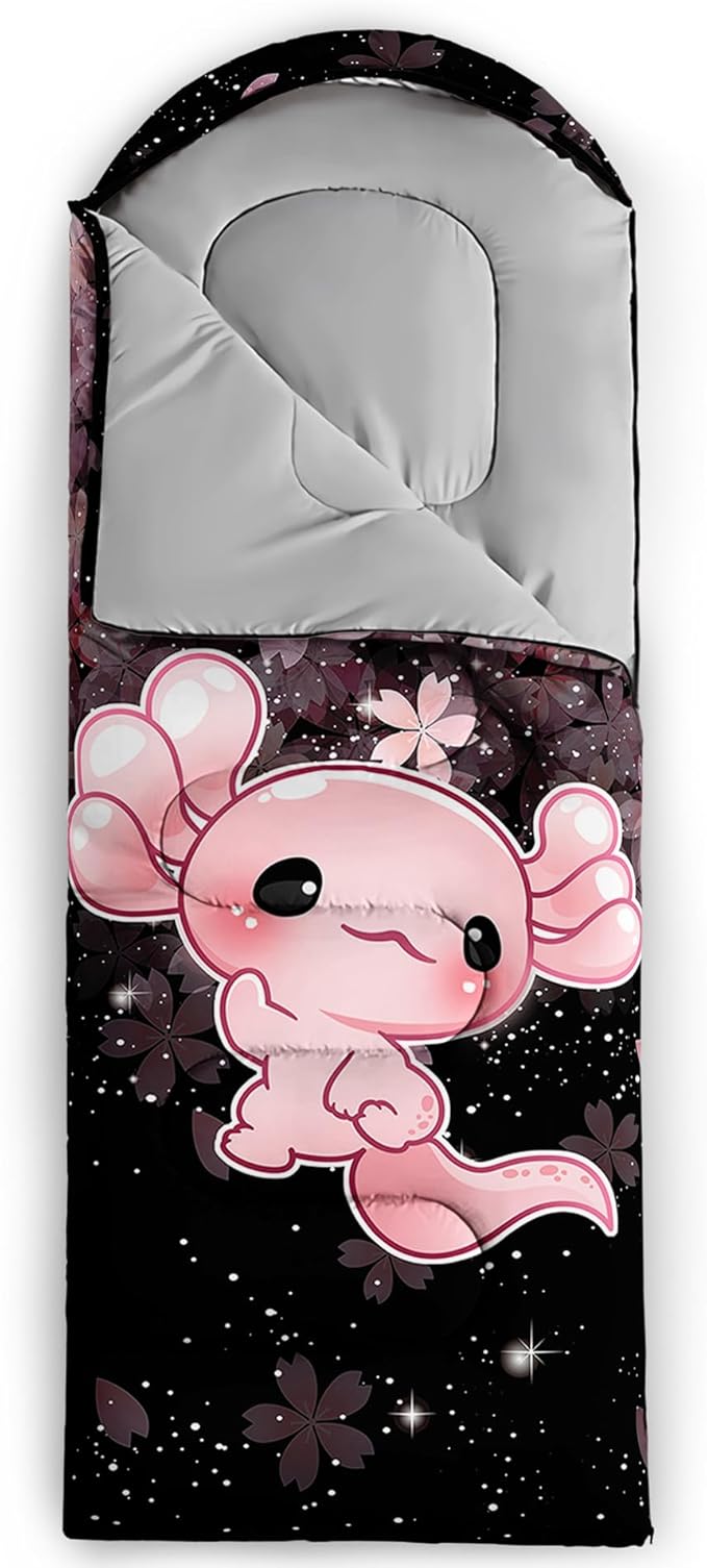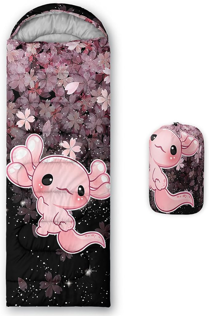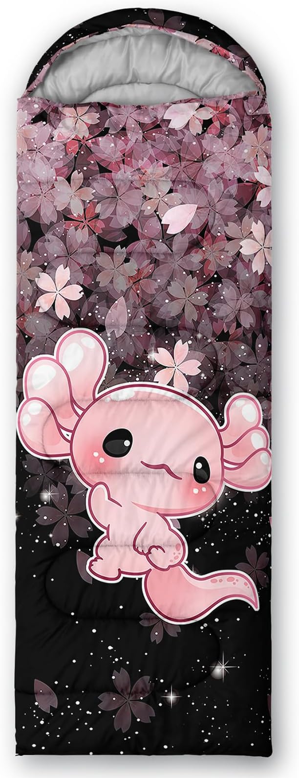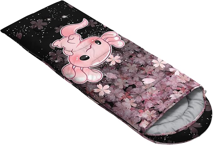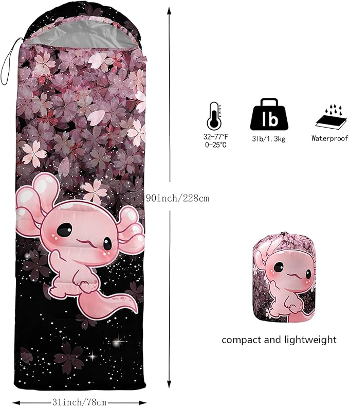 • 【Fits For 3 Seasons】: Size - 31 by 90 inches (W x D). Our Axolotl Cherry Blossom sleeping bag can be used in 3 seasons with a design temperature of 32℉-77℉(0℃-25℃). These Sleeping bags also have a weather resistant waterproof design to keep you warm and prevent you from any dampness.