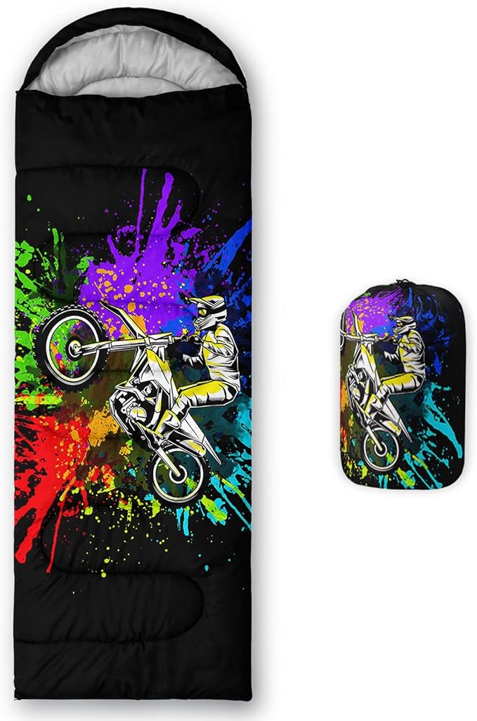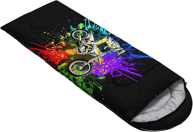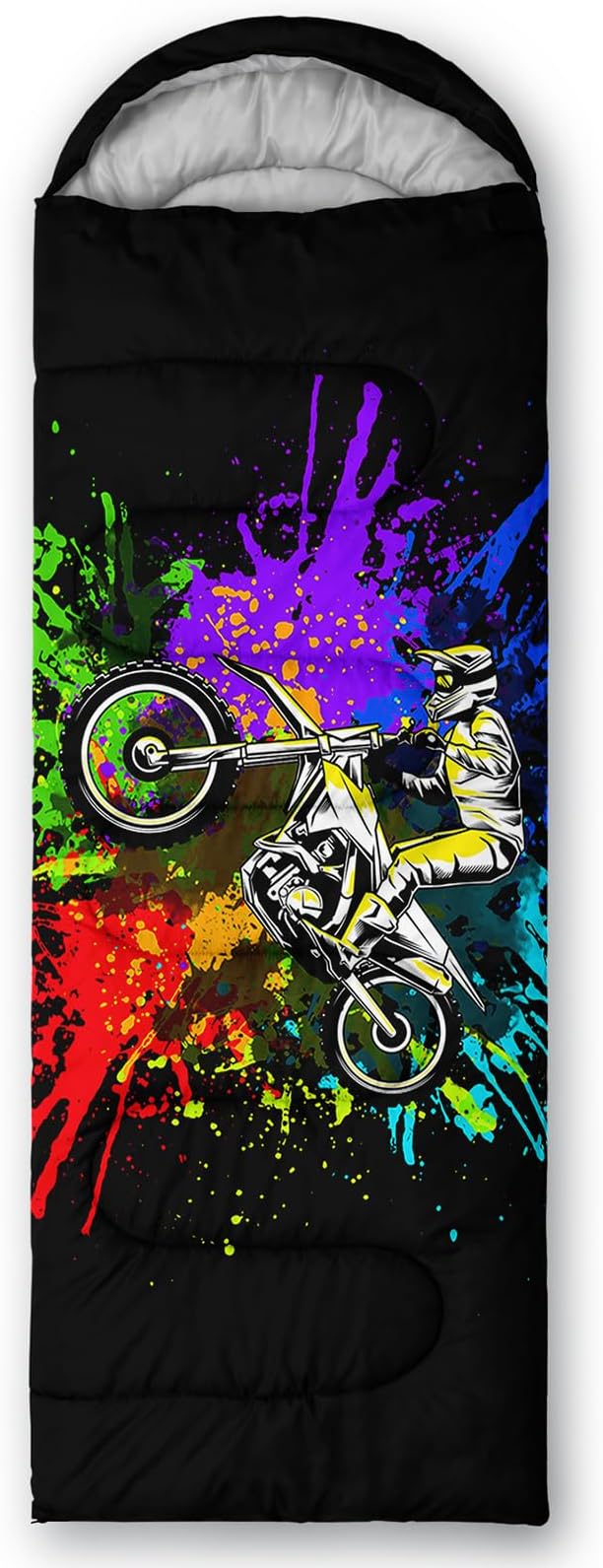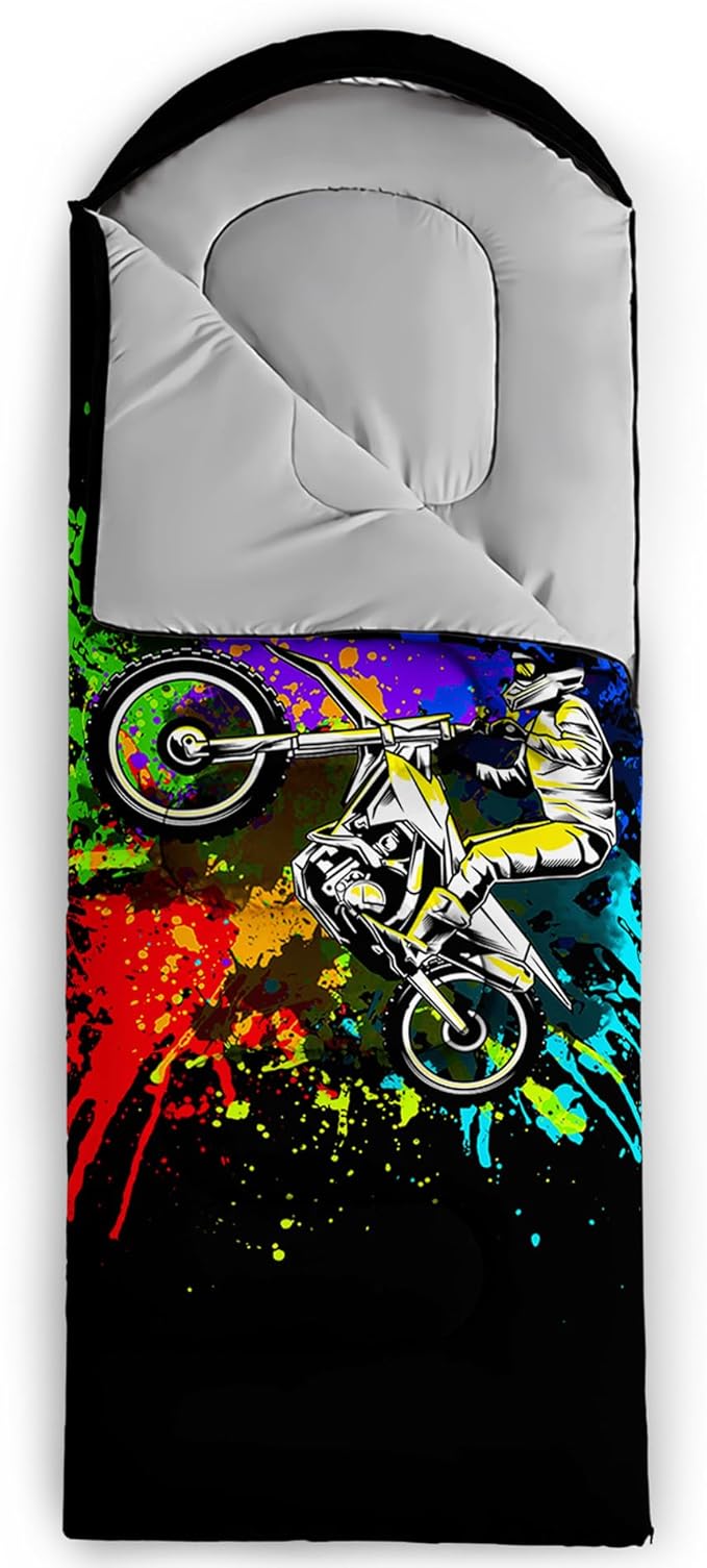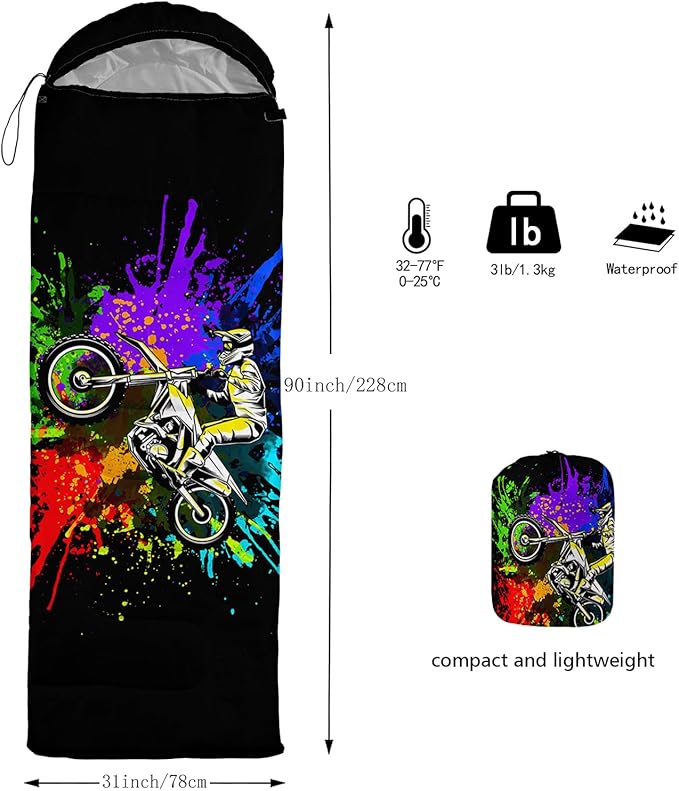 • 【Fits For 3 Seasons】: Size - 31 by 90 inches (W x D). Our Tie Dye Motocross sleeping bag can be used in 3 seasons with a design temperature of 32℉-77℉(0℃-25℃). These Sleeping bags also have a weather resistant waterproof design to keep you warm and prevent you from any dampness.