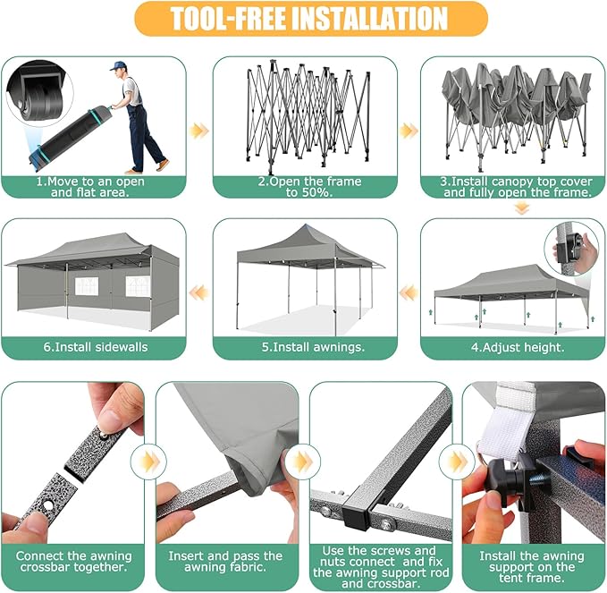 • 【Removable Awning】20% More Shade by the Awning. The 4 side walls with PU coating are connected to the top of the frame and the legs by a whole piece of touch fastener for fixing, and are detachable, you 10 x 20 canopy tent heavy duty can install any number of side walls. When in use, always secure the 10x20 pop up tent with the included stakes and ropes to avoid damage. One year after-sale protection for canopy frame; Six months after-sale protection for fabrics and accessories.