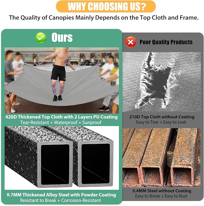 • 【420D PU Oxford Cloth】Heavy duty canopy tent 10x20 is made of 420D Oxford cloth with two layers of PU coating, UPF 50+, which blocks 99% of UV rays. Waterproof canopy gazebo tent with waterproof strip adopts heat-sealed seam technology, 100% waterproof, 1500mm waterproof pressure. Wedding tent professionally protects you from sun, wind and rain. Tents for parties is perfect for playground, yard, beaches, farm, gym, barbecu, trade shows, sporting event, disaster relief or other outdoor events.