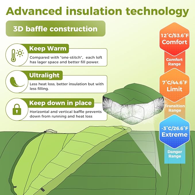 • DOWN SLEEPING BAGS: Filled with 300g COLDMASTER Down (51% RDS-Certified white duck down and 49% recycled synthetic), these sleeping bags for adults has unique vertical/horizontal baffle stitching to prevent cold spots, and windproof drawstrings and zipper draft tubes block chilling air flow. You can free your feet to stay cool in warm weather by opening the bottom zipper. Comfort rating 50℉, Limit rating 45℉, Extreme rating 25℉, it provides warmth as a 3 season sleeping bag