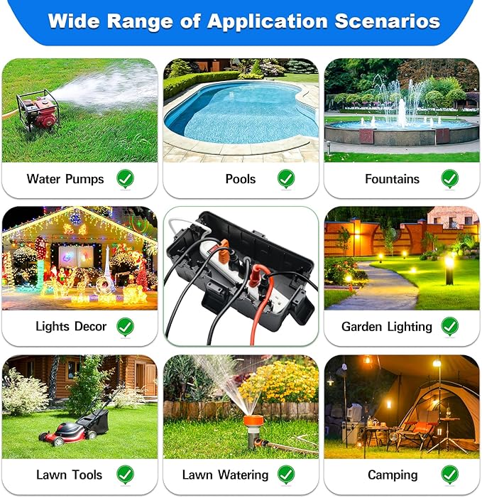 • WIDE APPLICATIONS:Ideal for a variety of outdoor & indoor applications including patio, lawn and garden power tools,holiday lighting, landscape decorations, pool pumps, fountains, fish ponds, patio heaters, hot tub, air conditioners, security cameras and more.