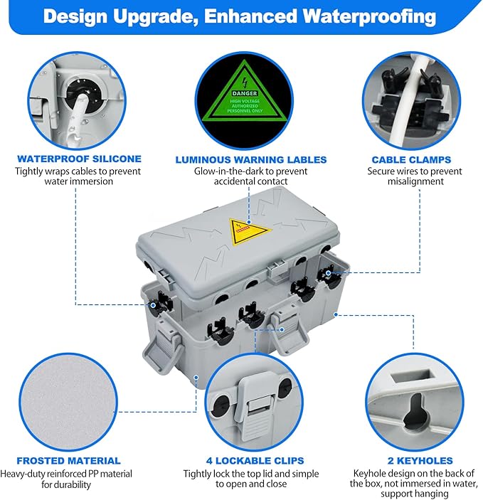 • 2 WAYS TO USE: 1. Can be placed horizontally on a flat surface; 2. Independent keyhole design on the back for hanging. EASY TO USE: Simply put the connecting cable into the waterproof box, secure the cable with the clip, wrap the cable tightly with rubber and close the lid.