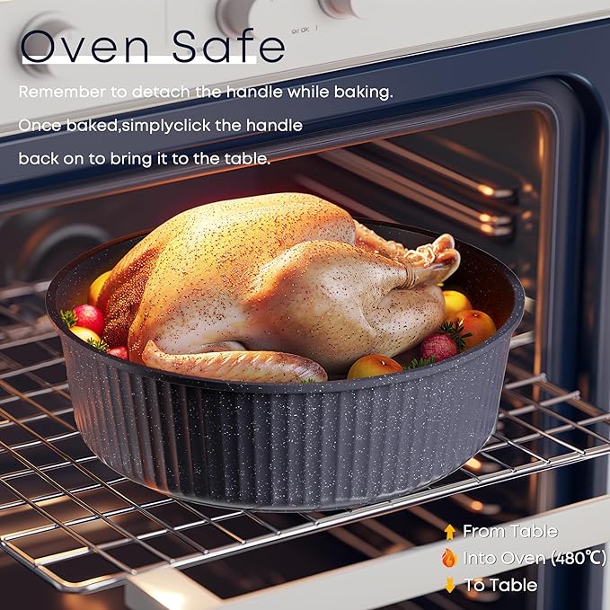 • Ultimate versatility: It features a detachable handle, enabling you to move it from the stove to the oven and then into the fridge. It can be easily placed in the trunk of the car. This cookware is suitable for use in the kitchen, during camping trips, and while traveling.