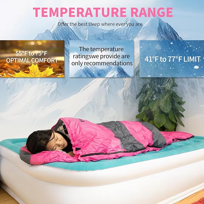 • 3 Season Sleeping Bags: Suitable for 3 season warm & cool weather - summer spring fall, Optimal comfort temperature 55℉ to 75℉(limit temperature 41℉ to 77℉). We provide three different weight of camping sleeping bag for you to choose, there’s always one for you to have a good night’s sleep.