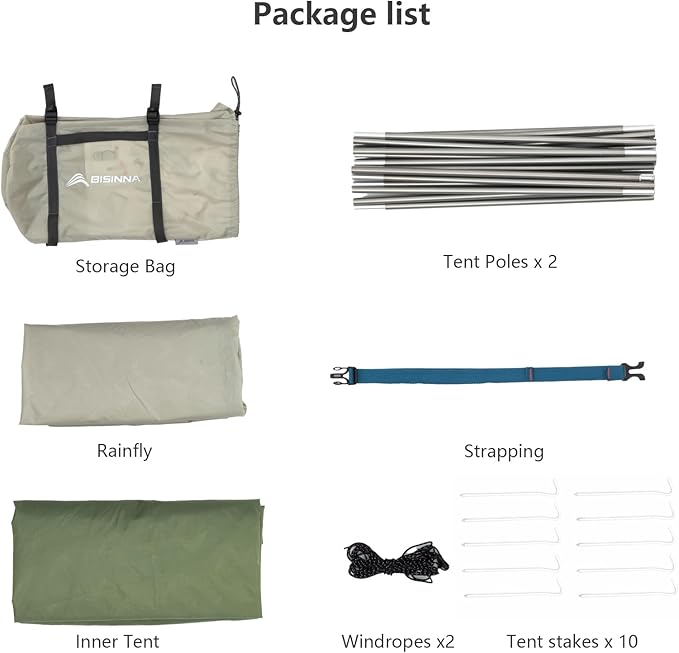 • 【Roomy 2-person Tent for 3 Seasons】: With the unfolding size of (23.6+55+23.6) x 82.7 x 47.2 (H) inches / (60+140+60) x 210 x 110 H cm.BISINNA backpacking tent is spacious enough to accommodate up to two people, perfect for couples .The tent also has double layers that is suitable for 3 Seasons and preferred use for Hiking, Expeditions, Fishing, Kayaking, Car Camping, Backpacking, or Bikepacking.