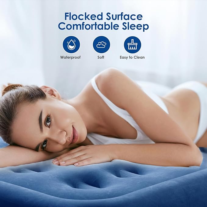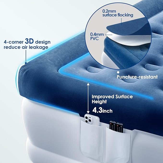 • Inflatable Mattress with Top-notch Materials: This inflatable mattress boasts heavy-duty PVC material and 100% soft flocked material, guaranteeing its longevity. Its 0.6mm thick surface layer provides excellent puncture resistance and waterproof properties. The top layer is wrapped with 4.3 inch height flocked material, which is gentle on the skin, non-irritating, and improves your sleeping experience.
