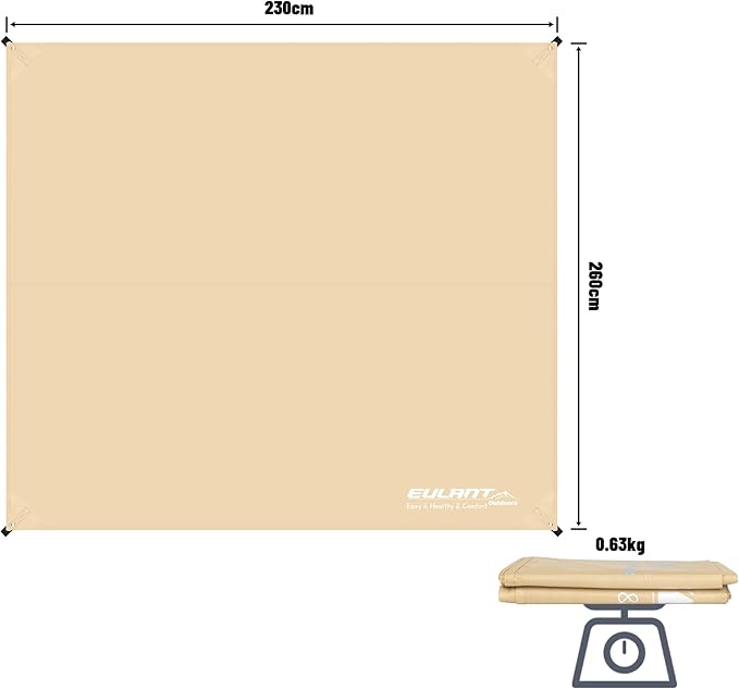 • ★Size: Our product size is 230×260cm(7.54ft X 8.53ft), the box size is 30.5*21*3.7㎝(12*8.26*1.45inch), and the weight only 0.63kg(1.38lbs), convenient and easy to carry, it's a must-have for your camping!Can be used with EULANT tents for a great sense of use