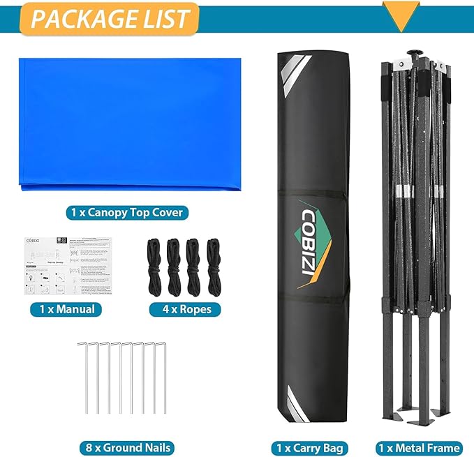 • 【43 SQ Feet Shade Area】COBIZI 6.6x6.6 pop up tent provides 43 SQFT spacious covered space, it can easily accommodate 3-5 people, meet your different needs for holding small gatherings. Perfect for wedding, birthday party, market event and other small events. When in use, always secure the 6.6x6.6 pop up tent with the included stakes and ropes to avoid damage. One year after-sale protection for canopy frame; Six months after-sale protection for fabrics and accessories.