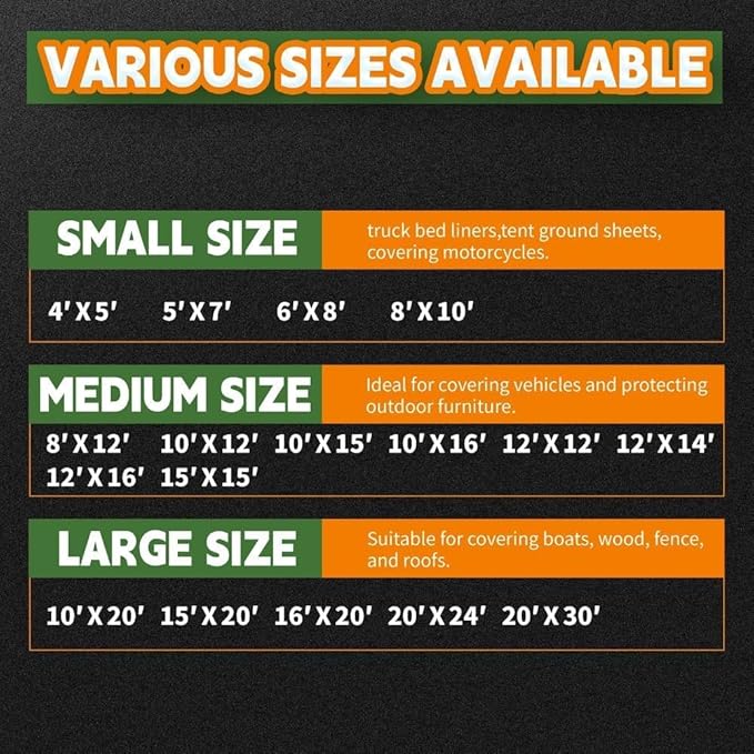 • 【FINISHED SIZE】The size of RAINDEWAY tarp is actual size that can be used, you will receive a full size tarp. This tarp can protect your roof, truck, car, tent, pet cages, boat, or outdoor furniture from rain, sand, dirt, and sunlight, You never know when a tarp will come in handy.