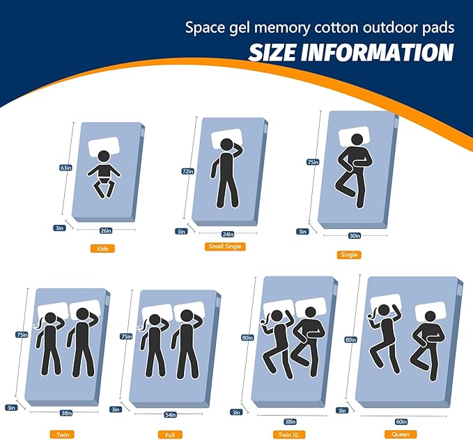• 【MULTI-SIZE OPTIONAL & AFTER-SALES SERVICE WITHIN 24 HOURS】 5 sizes for you to choose from camping mattress full size, kids (63x26x3") small single (72x24x3”) single (75x30x3”) twin (75x38x3”) twin xl size (80x38x3”), Be sure to choose the most suitable size. Since we shipped by vacuum compression packaging, please Open the package and place it for about 24-48hours. If you have any question, feel free to contact us. Please believe that we will solve the problem for you within 24 hours.