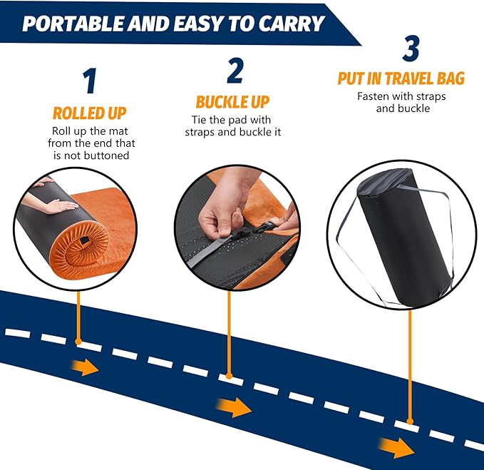 • 【EASY PORTABLE & WATERPROOF AND NON-SLIP BOTTOM】Free storage bag and packing straps are included. The adjustable buckle design on the fleece cover can help the portable mattress for adults to be easily rolled up and folded into the accompanying travel bag as camping gear, which saves space and is easy to carry. The non-slip waterproof fabric design on the bottom of the car camping mattress can adapt to various complex terrains from camping tent, such as slippery ground, stones, tree roots, etc.
