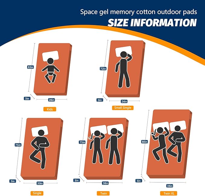 • 【MULTI-SIZE OPTIONAL & AFTER-SALES SERVICE WITHIN 24 HOURS】 5 sizes for you to choose from camping mattress full size, kids (63x26x3") small single (72x24x3”) single (75x30x3”) twin (75x38x3”) twin xl size (80x38x3”), Be sure to choose the most suitable size. Since we shipped by vacuum compression packaging, please Open the package and place it for about 24-48hours. If you have any question, feel free to contact us. Please believe that we will solve the problem for you within 24 hours.