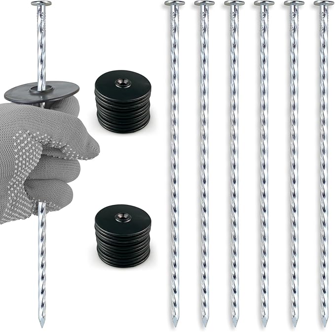 50 Pack 10-Inch Spiral Landscape Stakes wifh 50 Gasket, Heavy Duty Galvanized Metal Garden Landscape Stakes Kit for Securing Weed Barrier, Landscape Fabric, Artificial Grass, Floor Mat