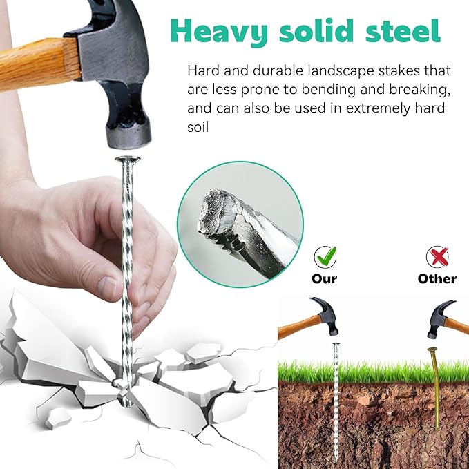 • SPIRAL STAKES + Thanks to the spiral design of the landscape stakes, the resistance of the landscape staples is greatly increased. Let it stay in the soil all the time, it won't come out easily, make sure the weed barrier fabric won't be carried away by strong wind