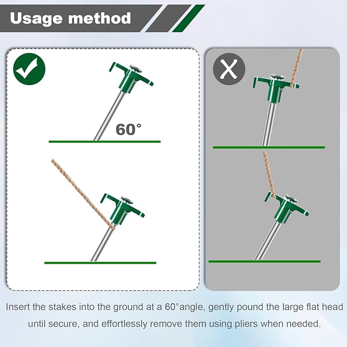• Ease of use and removal: Insert stakes into the ground at a 60° angle, gently pound the large flat head until secure. Effortlessly remove them using pliers when needed.