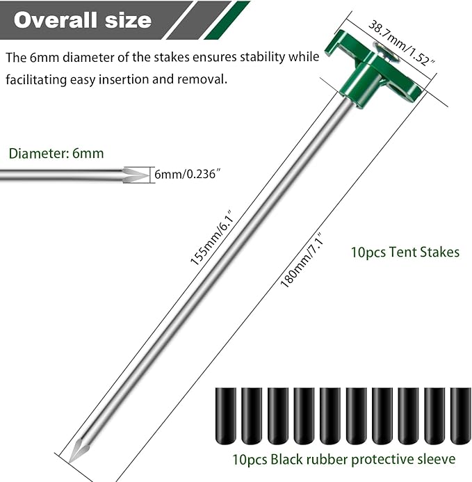 • Moderate diameter design: 10PCS green tent stakes; diameter 6mm, length 18cm/7.1in. The 6mm diameter ensures stability and facilitates easy insertion and removal.